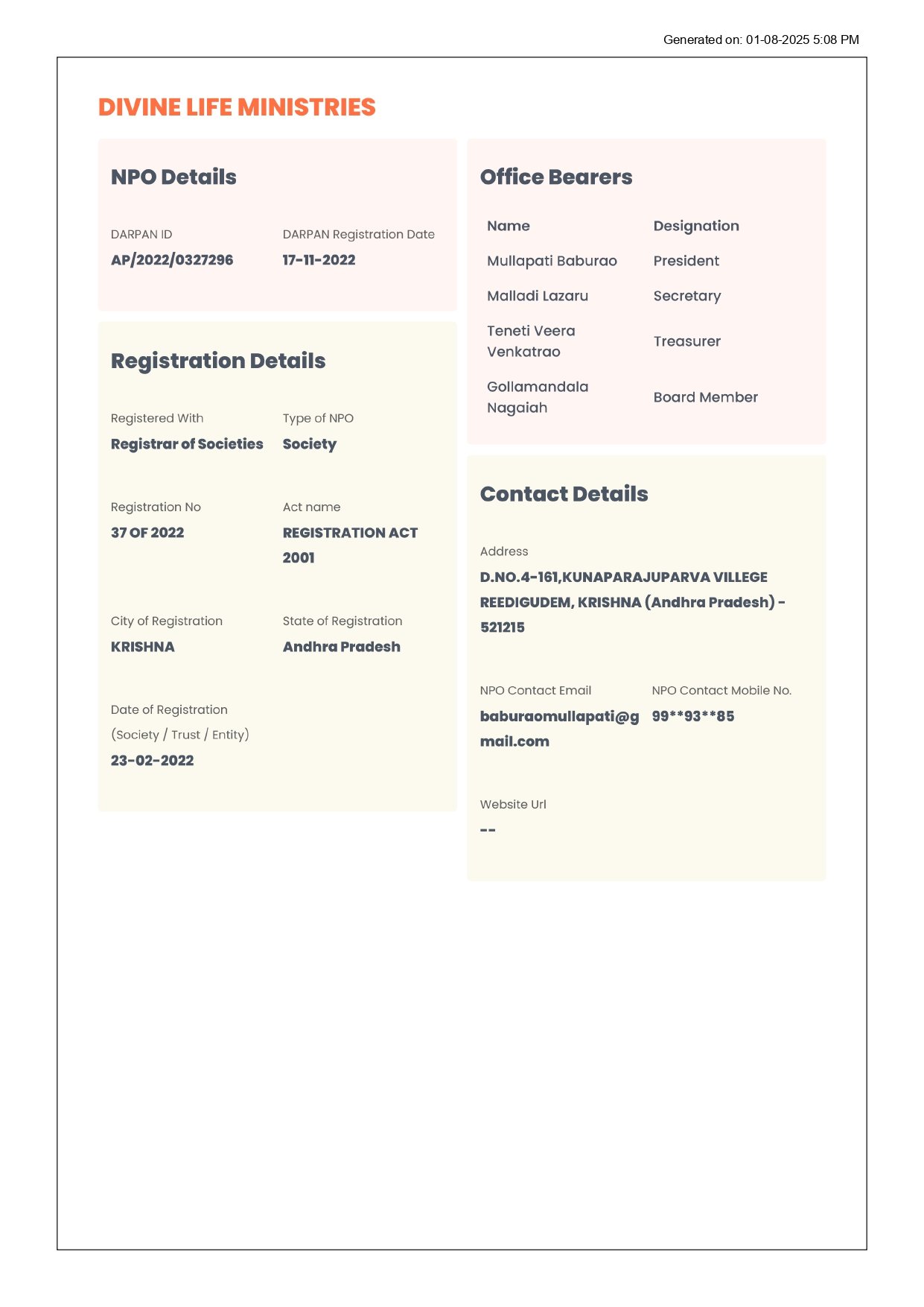 Our organization is led by a visionary leader, Sri. BABURAO MULLAPATI, whose unwavering commitment to our cause has been the driving force behind our success. Established in 2020, since then the organization has been expanding continuously in terms of social and Educational Development and Medical services, Food, and Sheltering for Orphans. It has worked for the promotion of sustainable, equitable, and participatory development, social welfare, and social justice through Programs for social work, the Establishment of Educational Technical and Medical Institutes supportive relief and education to the people, Health services, and other human service through social research and dissemination of socially relevant knowledge, social intervention through training and field action, contribution to social and welfare policy and program at State, National and International levels, over the years, The organization has among others (NGOs, Trusts) thrusts made A significant contribution to planning, action strategies, and Human Resource Development in several areas, ranging from sustainable rural and urban development to education, health, Agriculture, and Human Rights, in all case, the focus has been on the disadvantaged and marginalized section of societies, such as women, children and tribal. At DIVINE LIFE MINISTRIES , we envision a world where education is a fundamental right for all. Since our inception in [2022], we have been dedicated to breaking down barriers to education, especially for marginalized and disadvantaged communities. Through our school-building initiatives, scholarship programs, and teacher training, we are working towards creating a brighter future for children and youth, empowering them with the knowledge and skills they need to succeed.